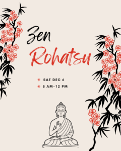 December 8th is regarded as the day the historical Buddha achieved enlightenment. Zen practitioners commemorate this event with Rohatsu (Japanese for 8th day of the 12th month) and typically do extra practice during this time. This year on Saturday December 6 from 8 AM to noon, the Bozeman Zen Group offers sitting and walking meditation with an oryoki breakfast (formal eating).